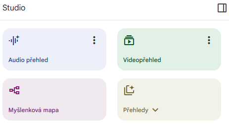 Studio má čtyři hlavní výstupy: audio shrnutí, video přehled, myšlenkovou mapu a klasický report.